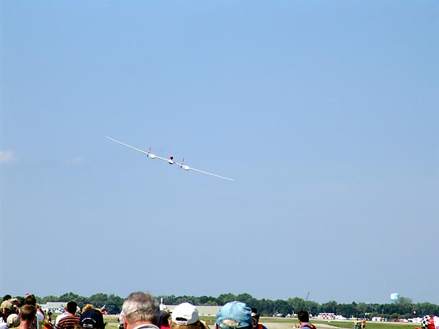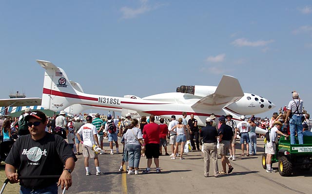 The 2005 EAA (Experimental Aircraft Association) fly-in and air show in Oshkosh is being held this week. I had heard that Space Ship One and the Global Flyer would be there, which I wanted to see, so I hopped in the car and headed for the show. The show is certainly the largest air show in the U.S. and probably in the world. It has been said that the small airport (Whitman field) owned by the EAA is the busiest airport in the U.S. while the show is on.